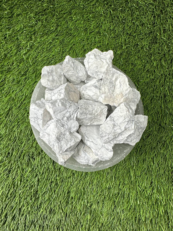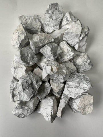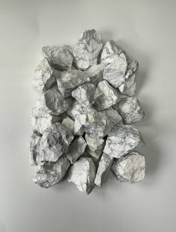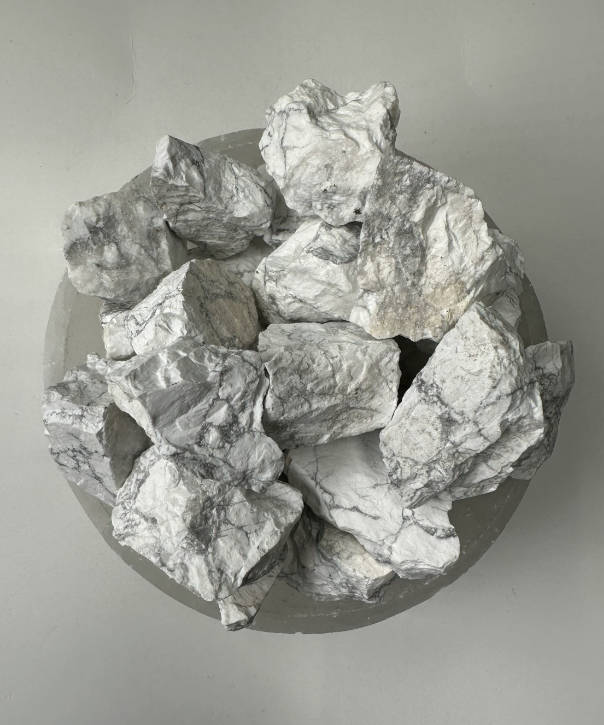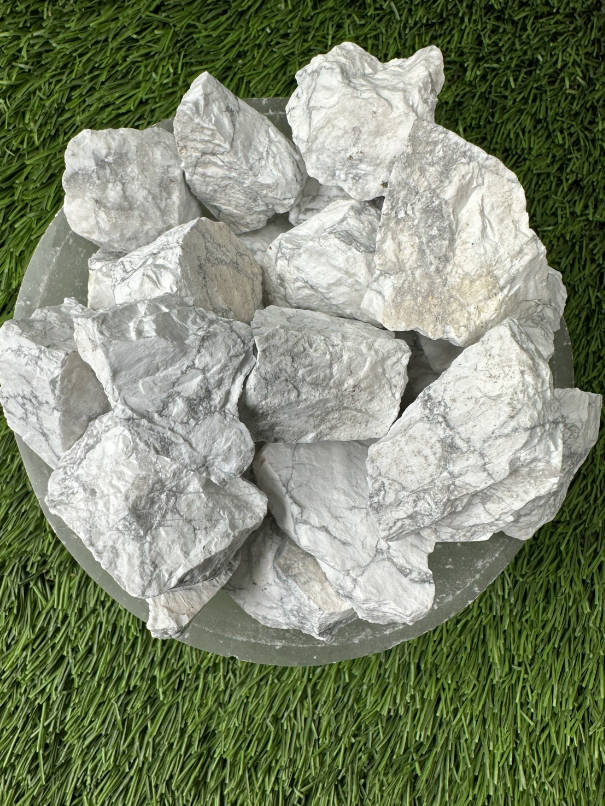 Howlite is a borate mineral comprised of irregular nodules and a monoclinic structure. Howlite has a porous texture and is also known as Magnesite. Its color scheme is chalky white with dark veins but it can also be colorless. Howlite is used for cabochons, decorative objects, beads, small carvings or jewelry components. This is a calming stone that, if placed under your pillow will help you sleep. It can also be made into crystal water and sipped an hour before bedtime. Howlite stills the mind and is excellent for sleep and meditation.